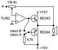 A gyakorlatban még nem próbáltam ki, majd holnap... hogyhogy mi változik a kapcsolónál ? Szerintem elég egyértelmű: B-osztályban sima push-pull pár, nyugalmi áram nulla, de az opamp kijavítja a hibákat. A-osztályban az a-minimum kapcsolásod, csak alul pnp van...