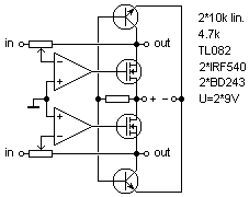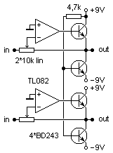 Azonos az előzőekkel, csak szimmetrikusan rajzoltam meg. A műv. erősítőt egy emitterkövetővel egészítjük ki, aminek egy primitív áramgenerátor adja a tápot. A hálózati táp nem teljes hullámú hanem fesz. kétszerező, de semmi búgás nincs, ez is teljesen jó.