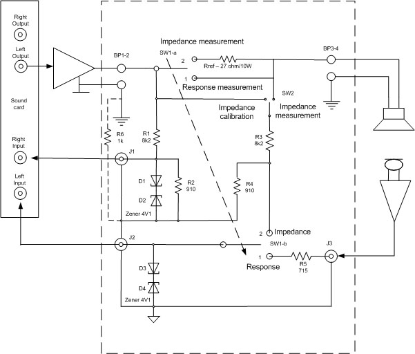 Igen így mérek. Ez az ARTA-BOX rajza. Kétféle mérésre alkalmas :impedancia mérés , és a hangszóró átvitelének mérése.