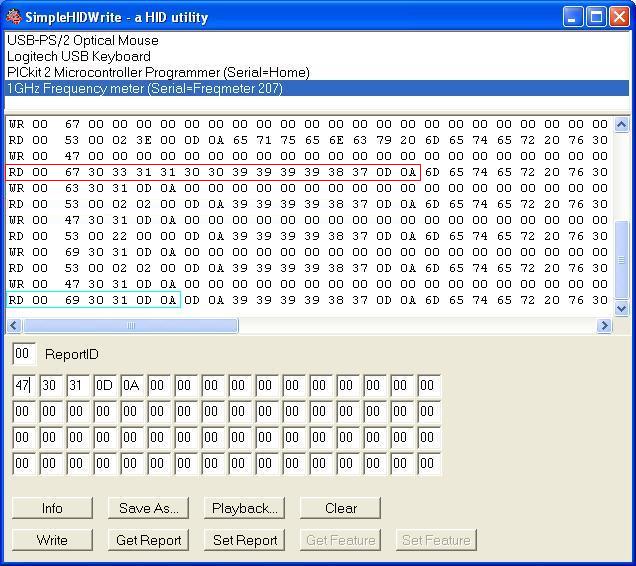 A frekvenciamérő már a PicKit2 soros kommunikációs programja helyett a hozzá készített USB-UART illesztőről jár. A USB_FREQ képen egy HID tesztporgram kommunikációs ablakjában a frekvencia mérő parancsforgalma látható. A piros téglalappal megjelölt részen a mérési eredmény kiolvasása látszik. A "30 39 39 39 39 38 37" a mérési eredmény 7 jegyű BCD formában, ASCII karakterekkel. A mérés összeállítása az USB_FREQ képen látható, ahol az LCD-n a 999.986 kHz mért érték olvasható le. A kék téglalappal jelölt részen egy bemenet váltás parancsra adott válasz jelenik meg. Az LCD-is a 2. bemeneti csatorna kijelzése látható (C2). Sziasztok.