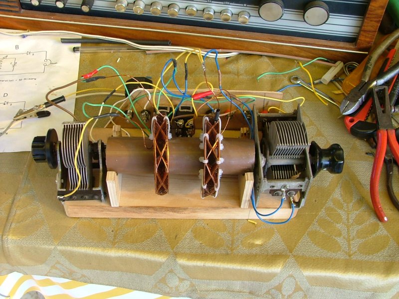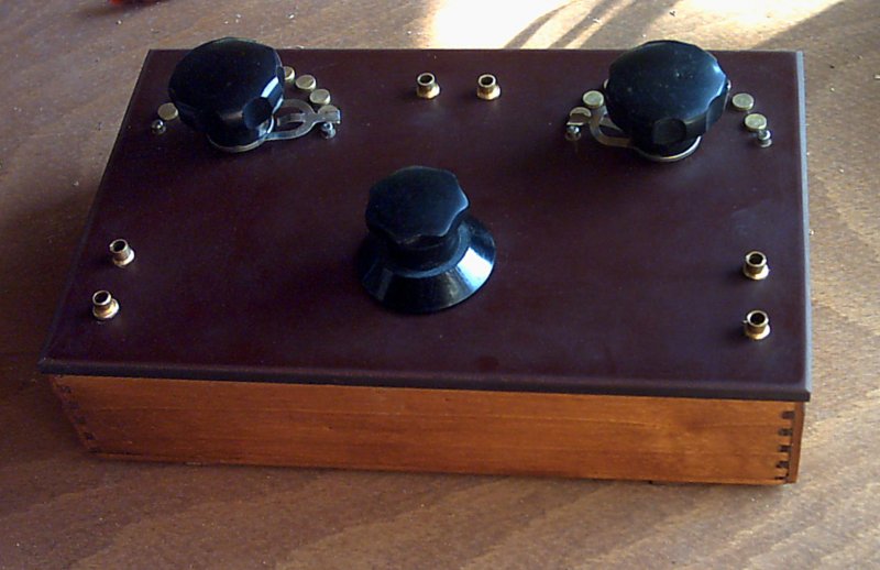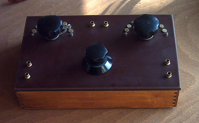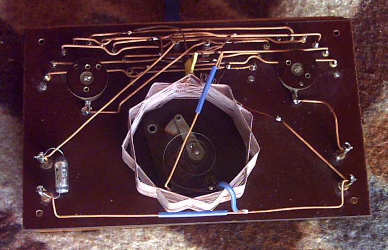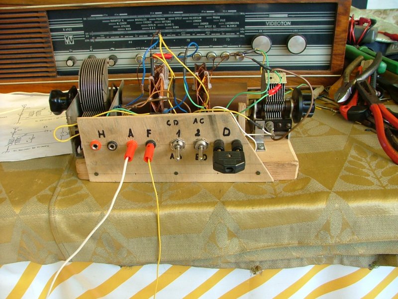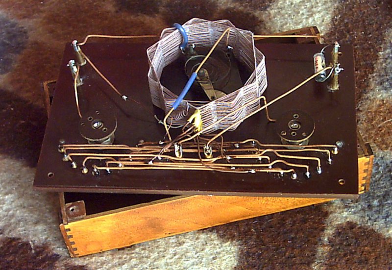 Egy most elkészült detektorosom, már régebben félkészen a honlapomon volt de a belsejével és a beüzemeléssel ma lettem készen. Kosárfonású 200 mikrohenry-s tekercse leágazásokkal készült, így a két kapcsolóval az antennát és a diódát(detektort) külön illeszteni lehet a rezgőkörhöz. A fokozatkapcsolók e célra feláldozott huzalpotencióméterek tengelyéből és csuszkájából készültek. Az érintkezők 4 mm-es sárgaréz szegecsek az 5 mm-es bakelitlapba szoros furatba ragasztva pillanatragasztóval. A képeket az építés fázisairól több részletben töltöm,hogy biztosan feltöltődjön.