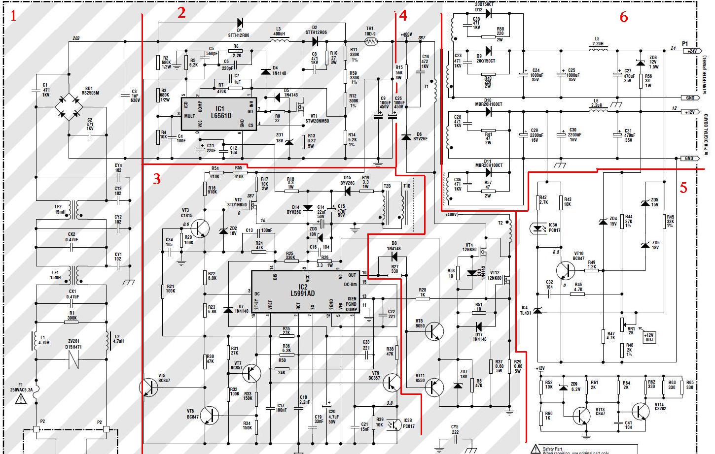 Adott egy Thomson 30" LCD Tv. A tápegysége a hibás. Gondoltam, hogy itt az ideje , hogy megismerjem ,megértsem és megtanuljam a kapcsoló üzemű tápok javítását. A Tápegység első ránézésre bonyolultnak tűnt. De miután beszereztem a kapcsolási rajzot és azt áttanulmányoztam letisztult a kép. A Kapcsoló üzemű tápegységek működéséről már olvastam itt. Hálózati feszültség szűrés, egyenirányítás, pufferelés n*10kHz-en egy Fettel megszaggatva kerül a trafó primer oldalára. Szekunder oldalt egyenirányítjuk , szűrjük. Dióhéjban ennyi. De emögött azért sokkal több dolog rejlik. A tápegységet 6 egységre bontottam. Szeretném egyenként áttekinteni. Sok kérdésem van. 1. Rész - Látom , hogy 6,3A biztosíték foglal helyet a panelon. Normál működés közben biztosan nem mekkora áramot vesz fel. Mekkora leválasztó transzformátor kell használnom? - Miért van szükség ilyen komoly szűrésre egy kapcsoló üzemű tápegységben? Milyen zavarokat, frekvenciákat szűrnek L1,2 És LF1,2 tekercsek és szűrők. - Miért szükségesek CY1-4 kondenzátorok.