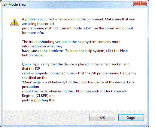 1: kizártad magad a chipből 2: nincs megfelelő tápellátása a programozandó ic-nek valamint nincs megfeleő fizikai kapcsolat (gondolok itt kontakthiba vagy felcserélt adatvezetékek) 3: a programozó beállításainál a "main" fül alatt nem a megfelelő chipet választottad ki valamint az isp frekvencia nem megfelelő Próbáld ki esetleg 1 másik AVR-el.
