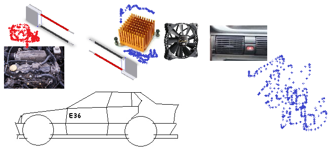 Tehát akkor, ha jól értem ez a peltier modul olyat is tud, hogy a hőt elektromos árammá alakítja, és olyat is, hogy az elektromos áram hatására hűt vagy fűt, tehát, akkor az megoldható, hogy az autó motorjára rakok egyet, az csinálja nekem az áramot, és ahol a ventilátor nyomja be a levegőt oda rakok be egy másikat(hűtés céljából) egy hűtőbordával ellátva, hogy nagyobb felületen adja le a hideget. Lásd kép, ez megvalósítható?