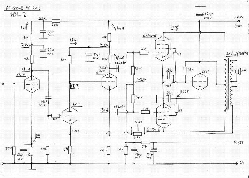 Megcsináltam 6N1P-re is a PP-t. Megemeltem 325 V-ig a segédrácsot, ha felkötöm 680 ohmmal a tápra, akkor 2*25 W fölött van a vége. 20-as áttételre kötve a kimenőt, hálózattól függően hajszál híján 30 W (pont mint a nálam lévő gyári 057-eseken. Ezek 8 ohmon 2,8 K-s Raa val mennek, kimenői szerintem nincsenek áttekerve. Kicsit más jellegű, de nagyon szép hangon szólnak, mérve kicsit rosszabb az enyémnél, mélyben is, magasban is, hangra nem merném állítani. A "szisszenve pusszantása" mintha jobb lenne közepes hangerőn, mint az enyémnek, de ez még fülelést igényel, mert rádión hallgattam csak (swiss jazz és swiss classic műholdról strong 6010-el, nem szg.-ről)). Már nem akarok vele többet foglalkozni, szerintem nagyon szépen szól, a kisebb segédráccsal olyan SE felé hajló. A macseknak kifejezetten tetszik a dizájn.