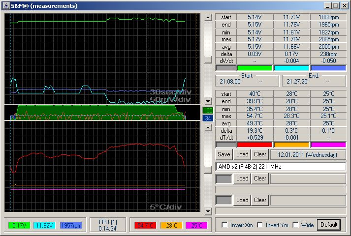 Azt tudhatod ebből meg pl hogy a hűtés elegendő-e a procidnak, mert ha igen akkor azt látod majd, hogy egy ideig emelkedik a hőfok (olyan jellegű görbével, ahogy egy kondi töltődik) és amikor elért valamekkora értéket akkor már alig alig emelkedik szóval tényleg ilyen "éados" görbe jellegű valami... rossz hűtésnél csak azt látod hogy emelkedik és még mindig emelkedik, ha jó a hűtés, akkor meg valami "barátságos" hőfoknál "kisimul" és egyenesben folytatódik a görbe... kézzel is leállítható a teszt, ha azt látod hogy mondjuk 65fok és még mindig emelkedne...