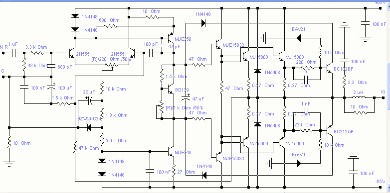 Itt egy nagy teljesítményű végfok rajza. A hozzá való körítést nem szeretném begépelni mégegyszer, ezért csak idézek egy másik fórumról: