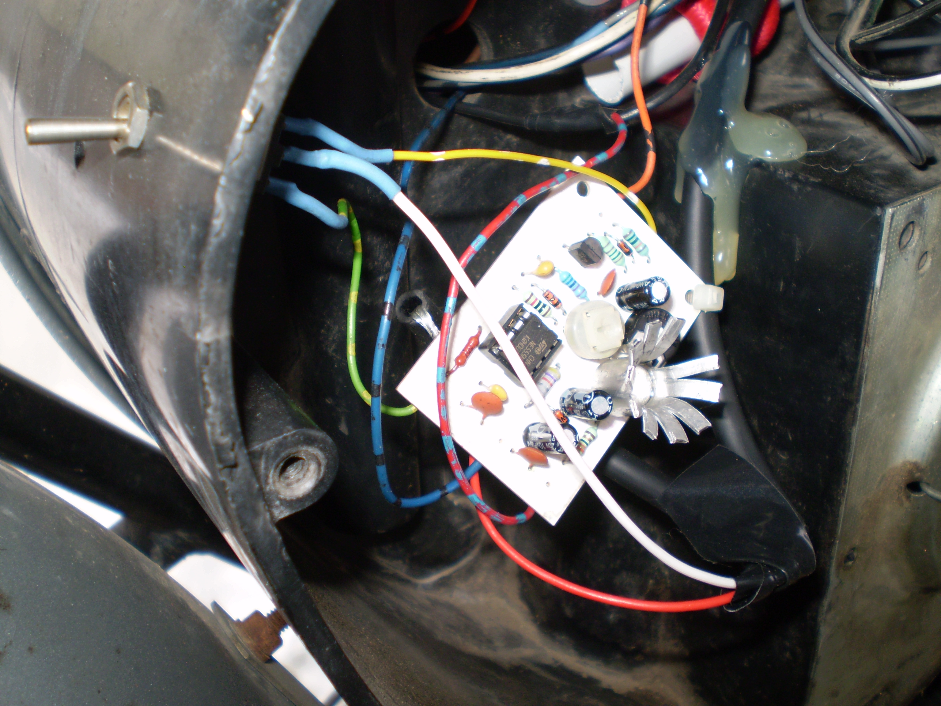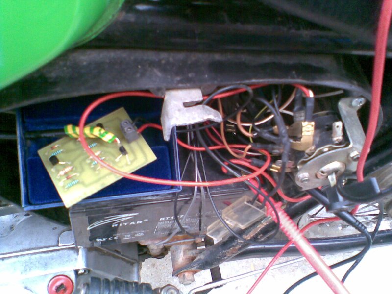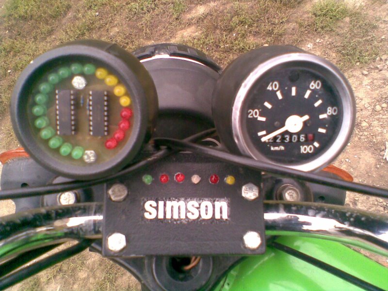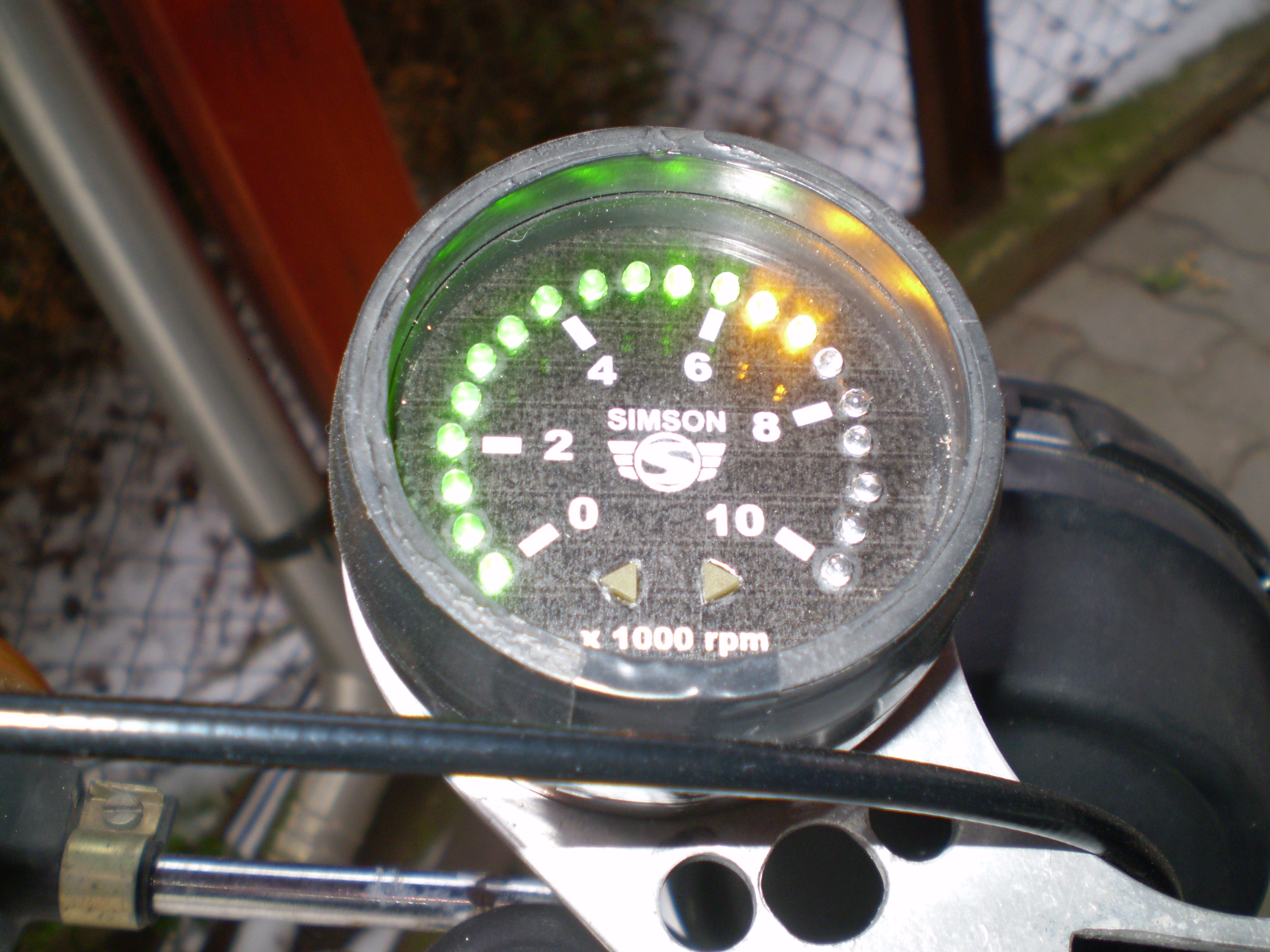 Tavaly építettem Simsonra fordulatszámmérőt. A vezérlő jelet a generátor adja. Egy kapcsoló átváltásával akkumulátor feszültséget mér. A képen látható háromszögletű ledek index visszajelzők.