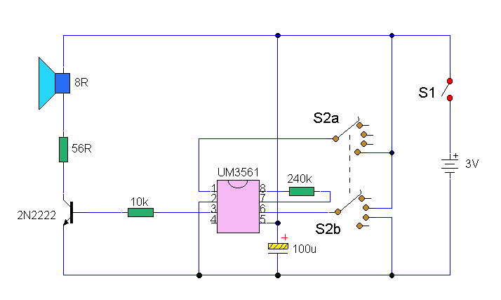 Röviden a kapcsiról: Többféle szirénahangot előállító kapcsolás UM3561 típusú IC-vel.