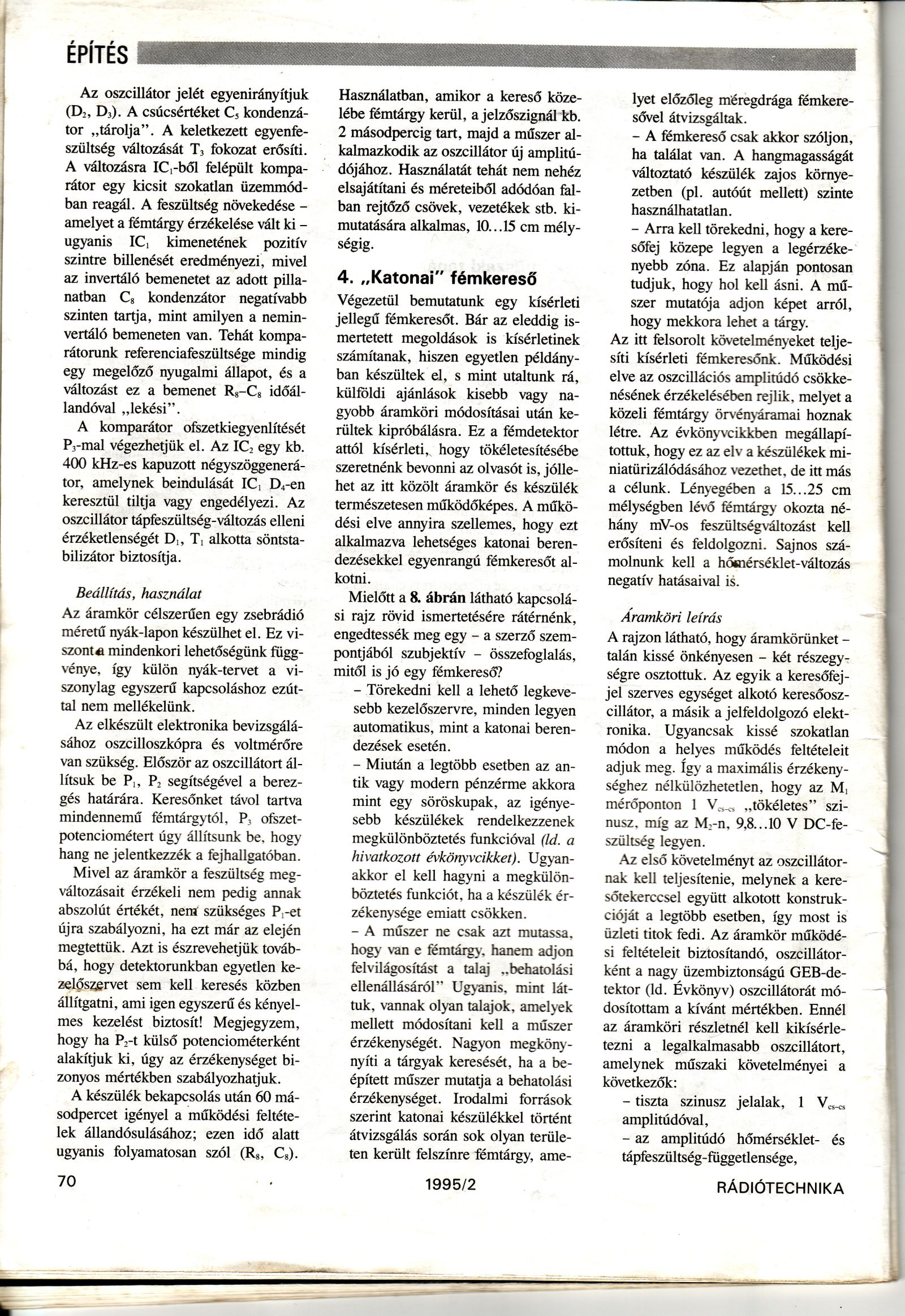 Talá tudok segíteni! A Rádiótechnika 95/2-es számában van egy fémkereső ma is jól hozzáférhető alkatrészekből. Nekem is megvan már az összes alaktrész, csak nem építettem meg, mert eddig nem jutott rá idő. Megpróbálom feltenni, csak először scannert kell szerezzek (monjuk van a nagybáttyámnak). Tulajdonképen arra készült, hogy megtalálja a falban a vezetékeket, de szerintem neked is jó lessz. Jah meg van utánna egy katonai fémkereső is. Ez már komolyabb. Ha kell akkor azt is feltehetem.
