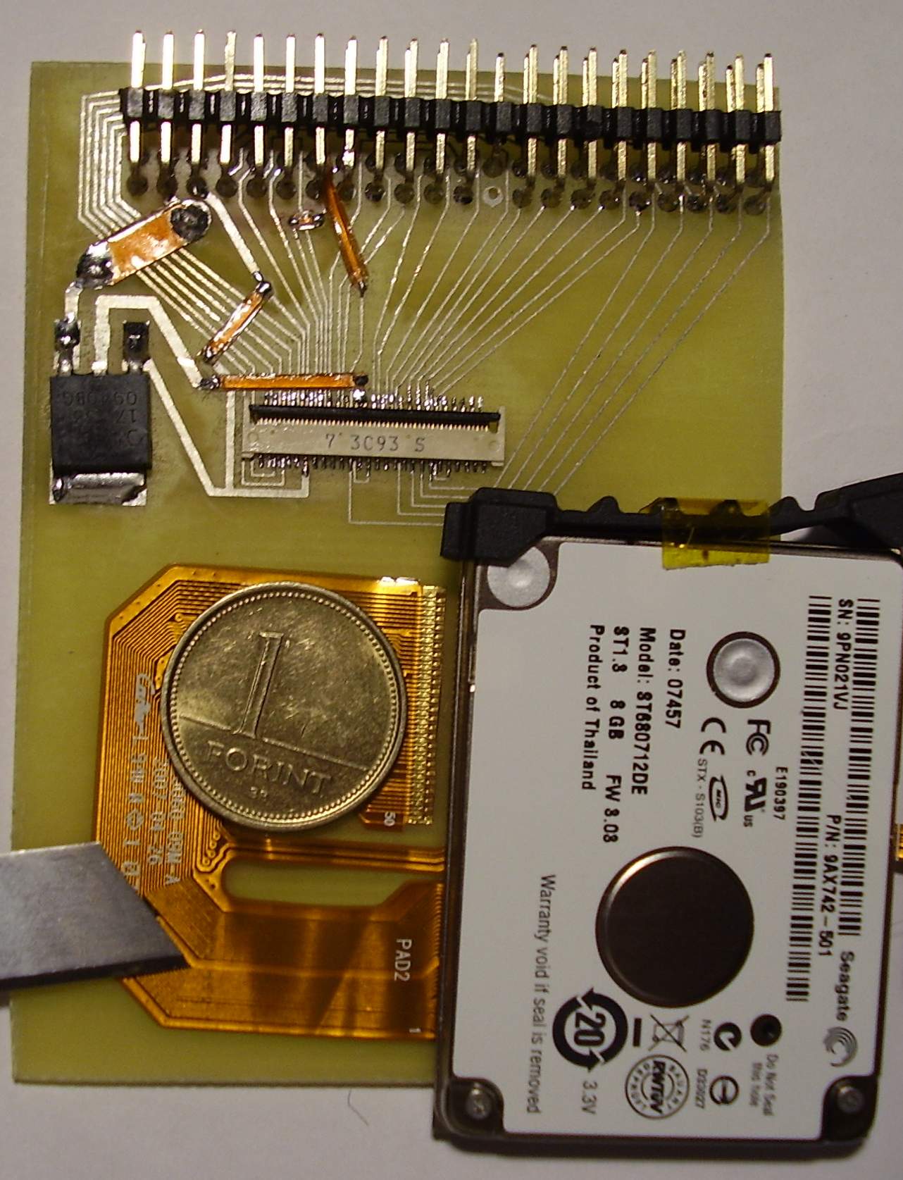 Készitettem egy adaptert egy Ameo pda ból kiszedett 8GB microdrive-hoz laptop ide csatival. A nyákról kép Bővebben: Link . A vinyó és a 2,5" ide lábkiosztása alapján figyelembe véve a szallagkábelt is. A csati már nem az eredetije mert nem élte túl a leszedést. Igy egy samsung csuszóelölapos mobil telefonban talált egy lábbal többel rendelkezö és más oldal láb kiosztásu csatival sikerült megoldanom. A szallagkábel végén is olyan cik-cakban vannak a lábak mint az AGP csatis videó kártyánál csak sokkal sürübben. Az elsö képen a legnagyobb vinyó egy laptopé.