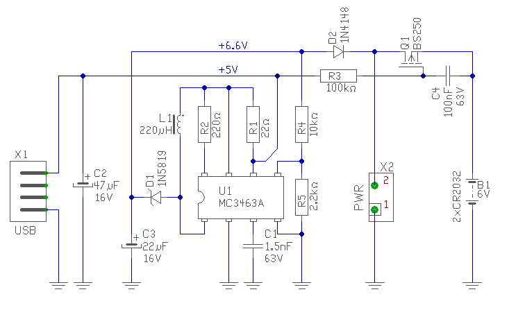 Gondolkodtam, mi lenne a célszerű megoldás. Sajnos egyszerű kapcsolóelemekkel (Fet-el) nem oly könnyű megoldani a feladatot, mint elsőre látszik, mert a Fet-ben lévő parazita dióda visszatáplálja a villanyt az 5V-os részre, és akkor már nem lehet észlelni, hogy meg van-e az 5V feszültség vagy sem. Természetesen azt is biztosítani kell, hogy az áramkör semmi esetre ne terhelje az elemet, ha az 5V jelen van. De.. Nem írtad, de gondolom túl nagy áramot nem veszel ki a 2db CR2015 elemből, így ez szerint nem kel nagy áramokat kapcsolni. De célszerű az 5V feszültséget , egy StepUp konverterrel feltornászni, és akkor már kér diódán keresztül is táplálható a szerkezet. Ha a telepek felől megengedhető 0,3V feszültségesésé, akkor elég egy Schottky dióda az elválasztásra. Ha nem, akkor egy Fet kell. Működése: Az MC34063-al készített StepUp konverter, feltornássza a feszültséget, 6,6V feszültségre. Ebből a közösítődiódán levonódik a 0,6V, és kb. 6V kerül a fogyasztóra. Természetesen ekkor a telep felőli dióda vagy Fet zárva van. (A Fet GS feszültsége ekkor, kb. 1V ami a telep, és az 5V között mérhető.) Ha az 5V feszültség lecsökken (megszűnik), akkor a telep felől a diódán keresztül kap ellátást a fogyasztó. Fet esetén, a leesett 5V feszültség kinyitja a tranzisztort. A konverter, kb 3V-ig előállítja a szükséges 6,6V feszültséget, ez után esni kezd a kimenő feszültsége. De 3V esetén, a Fet GS feszültsége már eléri a 2-3V-os szintet, mire a Fet kinyit, és rajta keresztül táplálkozik a fogyasztó. A Fet GS közötti kondinak az 5V bekapcsolásakor van szerepe. Amikor az 5V megjelenik, a konverter azonnal nem tudja előállítani a 6,6V feszültséget, viszont a Fet azonnali hatállyal lezárna. Ezt akadályozza meg a kondi a töltésével. Mire a Fet lezár, a konverter már készíti a villanyt. Konverteres üzem esetén, a Fet diódája "visszatölti" a telepeket, ha azok feszültsége nem éri el, az 5,8V-os szintet. De gondolom ez nem gond számukra, legalább "felfrissülnek kicsit". üdv! proli007