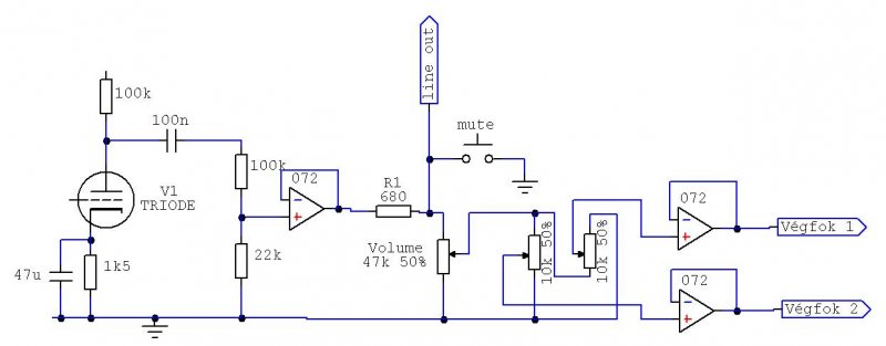 Az osztó után nálam még kell egy külön buffer, mert arról megy a szimmetrizált vonalkimenetet adó kapcsolásra a jel és a " master" hangerő, valamint a "mute" is annak a kimenetén van.