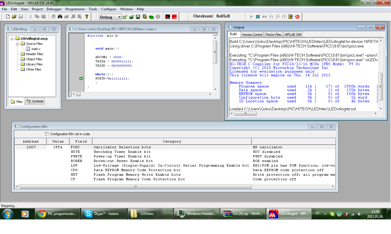 Pic-et szeretnék programozni HITECH C-nyelven már asmben úgy ahogy megy, mindent úgy csinállok ahogy itt le van írva, de ezt a csatolmányban levő hibaüzenetet kapom. Viszont ha Universal toolsuitot használlok, akkor lefordítja, beégetem a PICbe a fájlt, de nem akar működni. A PIC és az égető is jó assemblerből fordított fájlal működik.