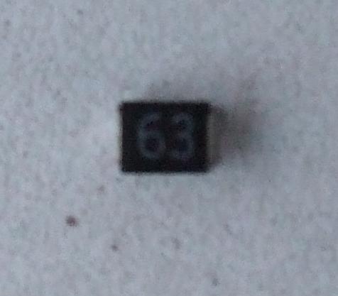 Fényképet egyenlőre nem tudok készíteni, de mint ahogy már írtam egy full fekete, 3x2mm-es, kétlábú alkatrész, aminek a tetején csak fehérrel írt 63-as felirat díszeleg.
