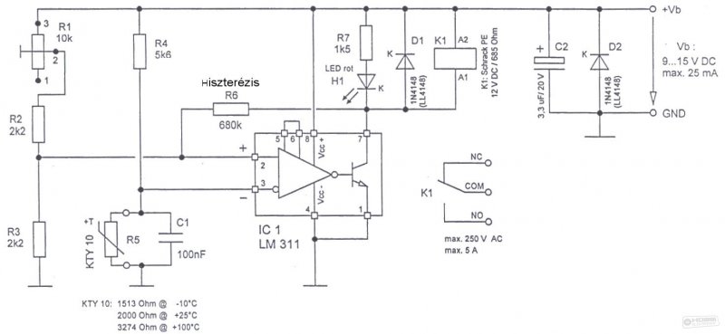 Korábbi hozzászólásomban ott van egy kapcsolás. Én is azt építettem meg. KTY-10 helyett KTY82-220-at raktam be és a relével párhuzamosan kellett kötnöm egy 1000µF-os kondit. Hibátlanul működik.
