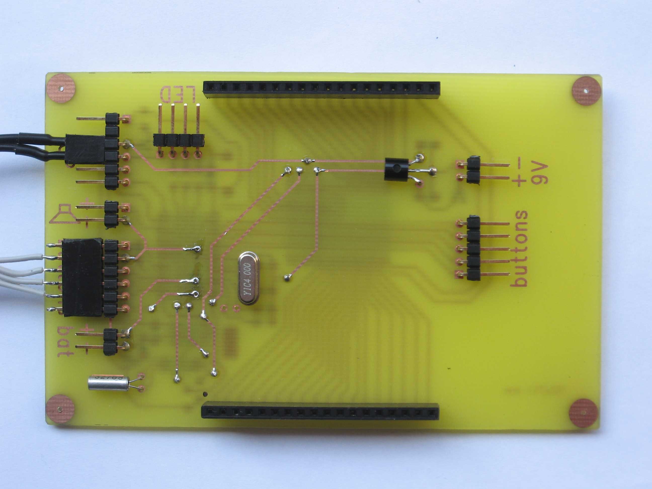 Csöngetni nem tud, mert minek? A csengetést megírni egyébként nem feladat, csak nekem nem kell ilyen funkció. Valószínűleg visszakerül a fiók aljára oda, ahol az alkatrészek voltak. Bár van hangszóró és LED kivezetése, de nem használom. Meg van kb. 10 nyomógomb bemenet, de 3 elegendő a beállításhoz.