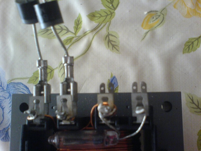 A képen látható trafón két kamra van. Az egyik (az első képen láthatóan lefelé eső) a primer tekercs, két részből áll, ezeket sorba köve (a jobboldali átkötéssel) erre kell kötni a hálózati feszültséget. A felső részen látható a két szekunder tekercs. A vastagabb, amire a két dióda van rákötve, egy középleágazásos tekercs, melynek a közepe össze van kötve a második, vékonyabb vezetékből tekert szekunder egyik végével Ez lesz a szekunderek közös földje. Ha a primerre (kellő óvatossággal és körültekintéssel) rákötöd a hálózati feszültséget, akkor a szekunderen megmérheted a feszültségeket.