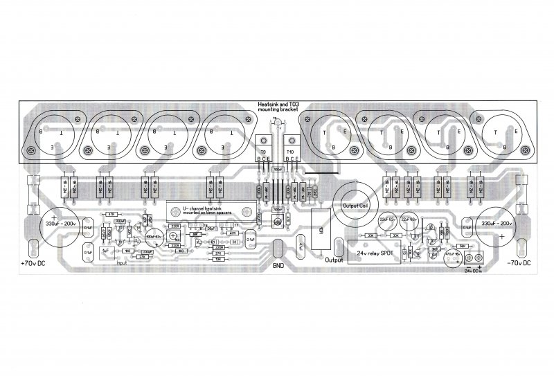Alkotó úrtól kérnék egy kis segítséget ? Szia meg építettem az utolsó QUAD-405 ös verziódat egy kicsit módosítva mert más alkatrészeim voltak itthon a bc 307-sek helyére 640 esek kerültek a 2n2219 helyére bc300 a Bd242 helyére MJE15033 és a MJL3281A helyére2SC5200 a panelt egy kicsit meg kellet változtatnom a tranyók lábkiosztása miatt és az új biztosíték és csatlakozók miatt .Indult elsőre és közepes hangerőig kb 40W gyönyörűen szól de a felett úgy szól mintha kifogyott volna belőle a szufla kopog és erőtlen és torz. A tápom minta képen is látszik 1000W szűrt táp 2X40 000 uf dal úgy, hogy az bírja is feszkó nem esik sem a bemenet csatlakozóin +-50V sem a műveleti erősítő 4-7lábán+-14,6V .Első indításnál 64mA nyugalmi áramot mértem.Sajnos a szkópom behalt így tőled kérnék segítséget. Egyébként mind a két panel ilyen. Köszönöm az ötleteiteket.
