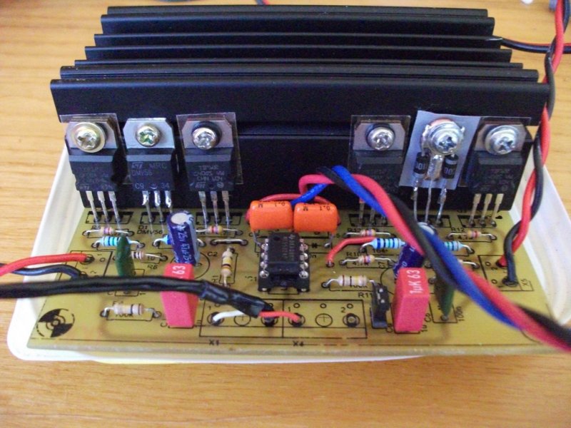 A műveleti erősítőt pont, hogy beforrasztottam volna, a kábeleket meg csatlakozóval vagy forrtüskével kötöttem volna be. A hűtőborda szép és praktikus, de a teli felületű (csavarvágat nélküli), egy kicsit jobban vezeti el a hőt. Igaz, azt fúrni kell. (Paszta van a tranyók alatt? Nem látom sehol sem kibuggyanni...)