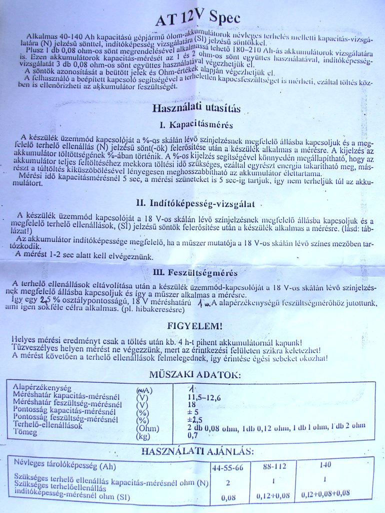 Van hozzá kapacitásméréshez és indítóképesség méréséhez való ellenállás is, többféle, hogy kisebb és nagyobb akkukat is lehessen mérni. A indítóképesség mérése nagyjából annyi, hogy pár másodpercre rábököd, felizzanak az ellenállások és közben nem szabad esnie a feszültségnek. Tehát mérni tulajdonképpen nem tud, mivel a skála csak saccolós és csak a feszültséget tudod nézni, hogy tartja-e közben... Üdv Inhouse