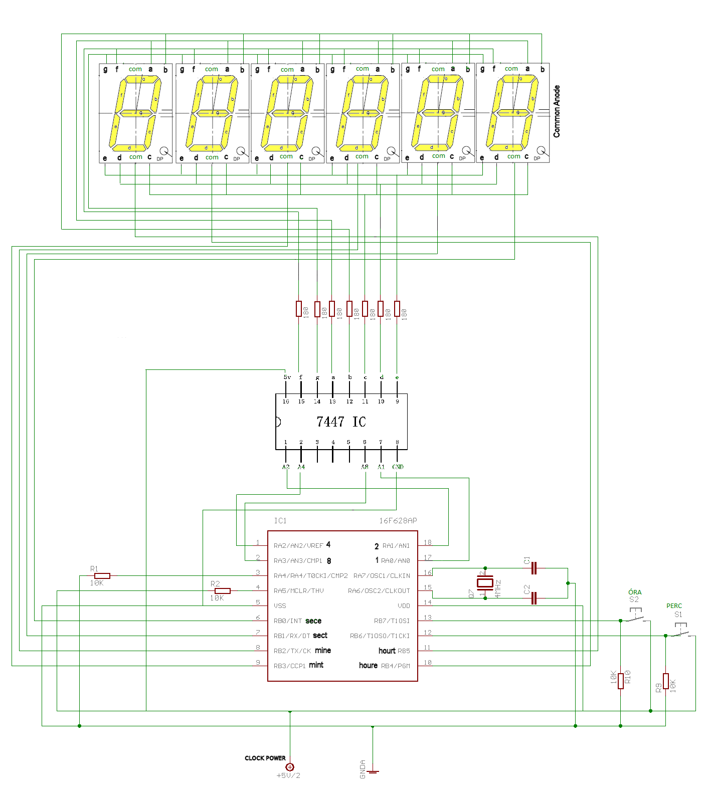 Én az égetőt egy próbapanelra készítettem el és azon van egy foglalat a pic nek,azon a panelon van az 1k -s. Meg van egy másik panel 2 gombal 4MHz es oszcilátorral a lehúzó ellenálásokal meg 2 tüskesorral a kivezetéseknek. A mellékletben lévő kapcsolást csináltam meg,csak a 7447 ic-t egy másik panelen helyezem el.