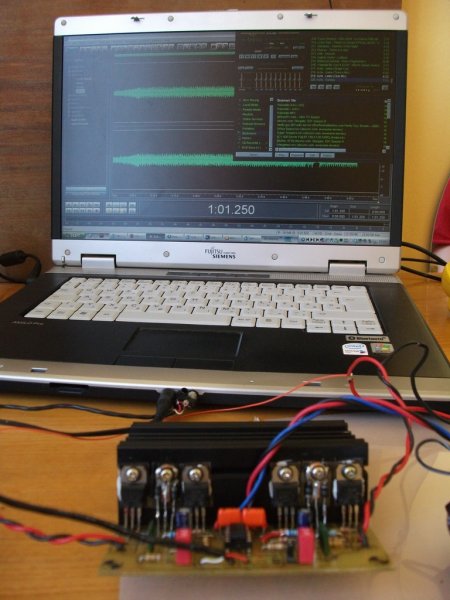 A műveleti erősítőt pont, hogy beforrasztottam volna, a kábeleket meg csatlakozóval vagy forrtüskével kötöttem volna be. A hűtőborda szép és praktikus, de a teli felületű (csavarvágat nélküli), egy kicsit jobban vezeti el a hőt. Igaz, azt fúrni kell. (Paszta van a tranyók alatt? Nem látom sehol sem kibuggyanni...)