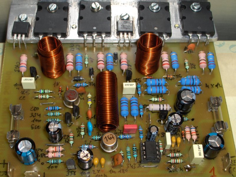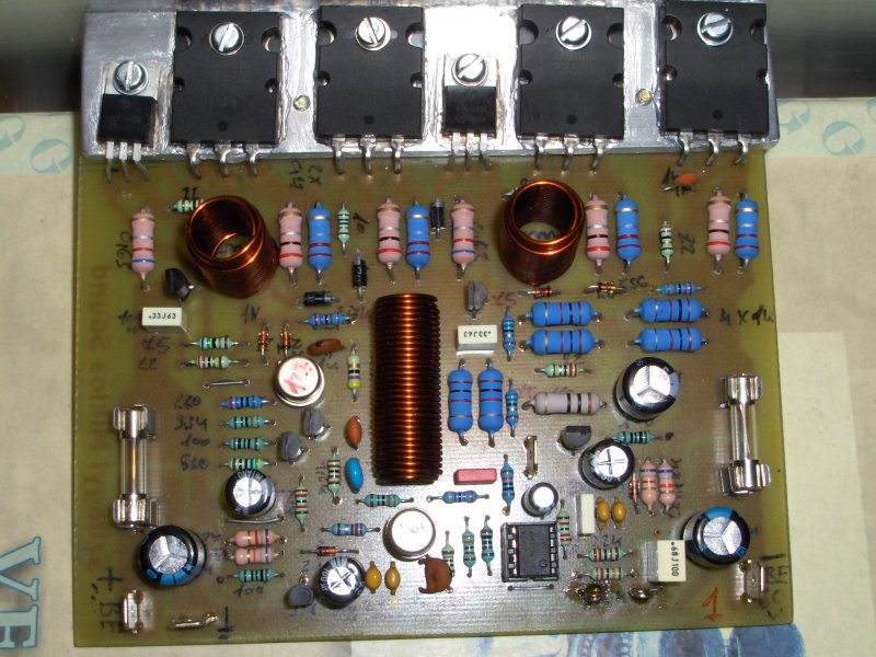 Csak feltételezésekbe tudok belemenni, ha tévednék nézd el nekem! Több ellenállást is érdekes értékben raktál be. - Pl nem értem a végtranyók emitterein lévő 2x0,22R/2W helyett berakott párosokat. Az egyik talán 0,1R, de a másikat színeit nem jól látja már öreg szemem. De az biztos, hogy nem 0,22R-ból van kettő. (amíg az érték nem nagyobb 0,1-0,2R-nál addig sok vizet nem zavar) - Az R30, R31 sem 4 egyforma, hanem, tagonként 1k+1,2K, de ez sem túl érdekes. - Végül amit szerintem teljesen elnéztél, az R35 és gondolom az R36 is. Ide a feliratozásod szerint 0,63R kéne, és ha jól silabizálom a csíkokat, akkor 0,62R került. Viszont ennek csak a tizede kéne, hiszen 0,063R a "hivatalos" érték. Ez pont a védelem "áramfigyelő" ellenállása, tehát ha ezt 10-szeresére növelted, akkor nagyon durván lecsökkentetted a kivehető teljesítményt is, mert sokkal hamarabb fog leszabályozni. Ilyen kicsi ellenálláshoz már célszerű ellenálláshuzalt használni. Esetleg két párhuzamos 0,12R is jó lehet.