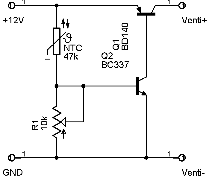 Na itt az, amit én használok. Az NTC-t valahogy be kell építeni, hogy a borda hőmérsékletét mérje. Én alul a bordába belemartam egy kis árkot az NTC-re menő vezetékeknek, ahol az NTC feje van, ott még fúróval egy kicsit megmélyítettem, tettem bele szilikon pasztát, és így az NTC bent van a borda és a processzor között, közel a maghoz. A potival be lehet állítani, mekkora max hőmérsékletet engedjen meg, és azután a hőmérséklettől függően állítja a fordulatszámot. Vagy ha nem akarsz hőmérsékletfüggő szabályzást, akkor az NTC helyére egy fix ellenállást kell tenni, és beállítani a kívánt fordulatszámot. Ebben az esetben természetesen nem kell a bordát bántani.