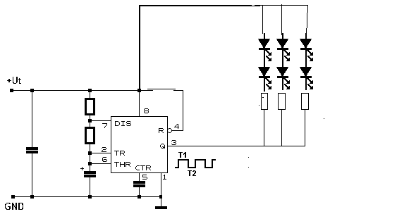 Üdv:Szerintem a mellékelt kapcsolásod (a kép)Nagyon is jó sőt tökéletes én ennek segítségével készítettem stroboszkópot én 9 V rol hajtattam és betettem egy teljesítmény tranyot az outputra és csak az output és + közötti ledet használtam az alatta levőt nem de hamarabb úgy csináltam és világított mindkettő tökéletesen felváltva szerintem ha neked nem villognak teljesen jól akkor a kondenzátornál lehet a gond ellenőrizd esetleg változtasd is ,mert ha mondjuk fehér ledet kapcsolsz rá akkor nagyobb a fogyasztás és az is lehet ok !Es meg betehetsz egy 1000 µF os kondit hogy szűrje a tapfeszt pláne ha adapterről hajtatod !Ennyit tudok mondani !