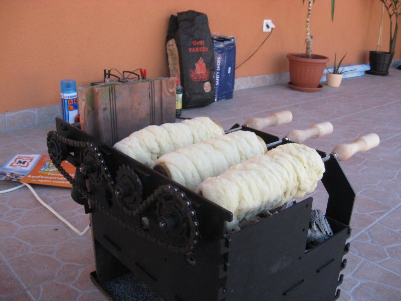 a házilagos sütéshez megfelel egy régi forgónyársas grillsütő, hozzá alakított kürtőskalács nyárssal.