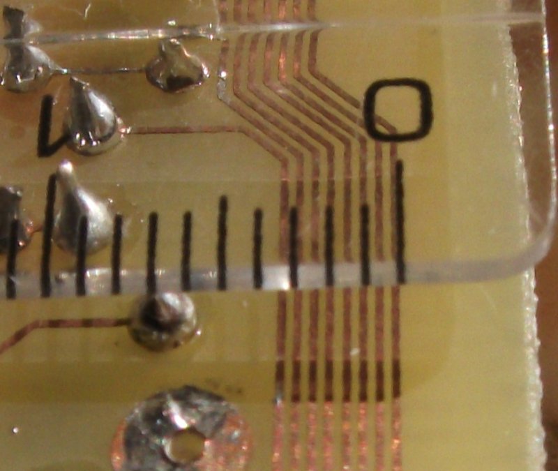 Ez igazából nem építmény, hanem NYÁK(részlet), de gondoltam, megmutatom, mert szerintem elég jó lett ahhoz képest, hogy vasaltam(illetve lamináltam, de mivel annak nem elég nagy a hőmérséklete, így a vasalóval kezdem, aztán laminálom). Látható, hogy kb. 3,5mm-es sávban megy egymás mellet nyolc vezetősáv.