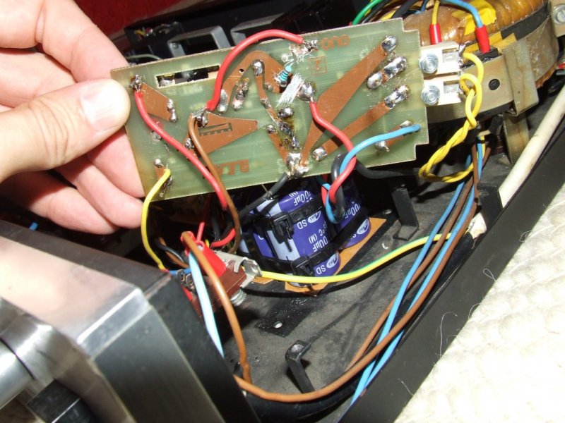 A brumm-mentesített testelésre és a tápellátásra vonatkozóan mellékeltem a kapcsrajzot, a testelési rajzot, amelyekben minden benne van részletesen és a fényképeket is. Szerencsére ez nem okozott akkora fejtörést, mint az Orion SE 260 esetében, ahol, mint ahogy korábban már írtam, elkövették azt a hibát, hogy a bemeneti jeleket körbekergették az egész készülékben és az előfokot a nagy toroid közelébe helyezték és ezeknek a hibáknak a kijavítása komoly fejtörés eredményeképpen hozta meg a kívánt eredményt. Itt, az AET 250 esetében ?csak? rendesen meg kellett csinálni a testelést és a tápellátást. Az egyik képen látszik, hogy a fesz-stabilizáló panelen egy fólia-kivágást kellett eszközölni, ugyanis eredetileg a Grätz és a nagy szűrőelkók között menő vezetékről csatlakoztatták ki a feszstab panel részére a bemenő-feszültséget.