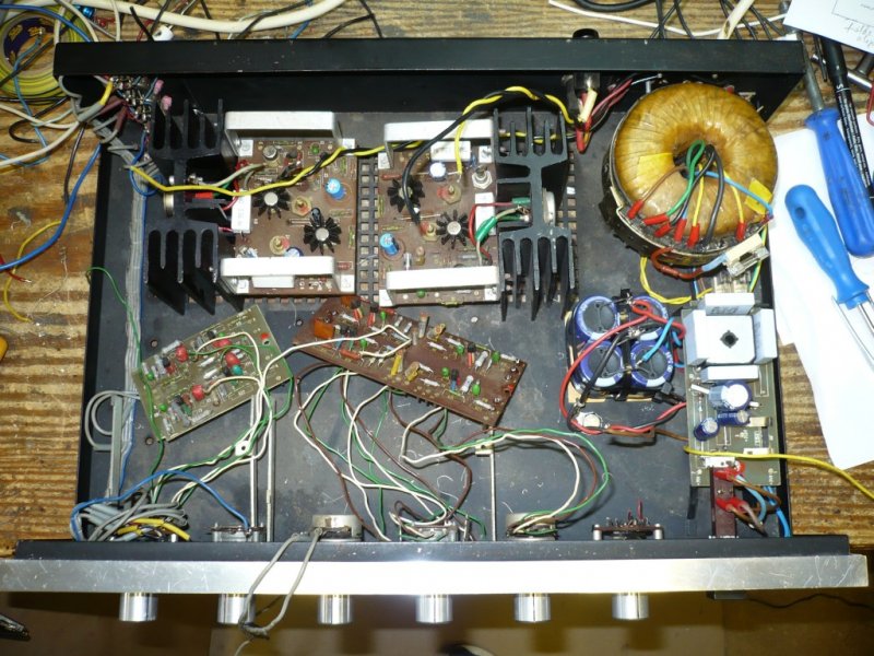 Az erősítő fokozatok közti huzalozás indokolatlanul sok és hosszú, keresztbe-kasul bandázsolt vezetéket tartalmaz, amelyeket célszerű megszüntetni. Ehhez az kell, hogy az összes bandázsolást szétvágjuk és maximum 3-4 centis ráhagyással újra kössünk mindent, hogy azért esetlegesen javítani is könnyedén tudjunk, ha arra kerülne sor, valamint figyelembe véve a korábban vázolt tápellátási és testelési topológiát is. Az ilymódon rövidített jelutak egyrészt az áthallási csillapítást nagymértékben javítják, másrészről egyéb hangminőségi javulást is okoznak, mint pl. a hangerő-csúszkáról az előfokba menő vezetékek egymáshoz képesti kapacitásai is megszűnnek. Ugyanezeket a vezetékeket fel lehet használni. Ha mindent jól csinálunk, összességében több méter felesleges vezetéket operálhatunk ki a készülékből... A belsős képeken jól látható, hogy az a dzsumbuj alulról, a panelek alatt és a potméterek környezetéből eltűnik.