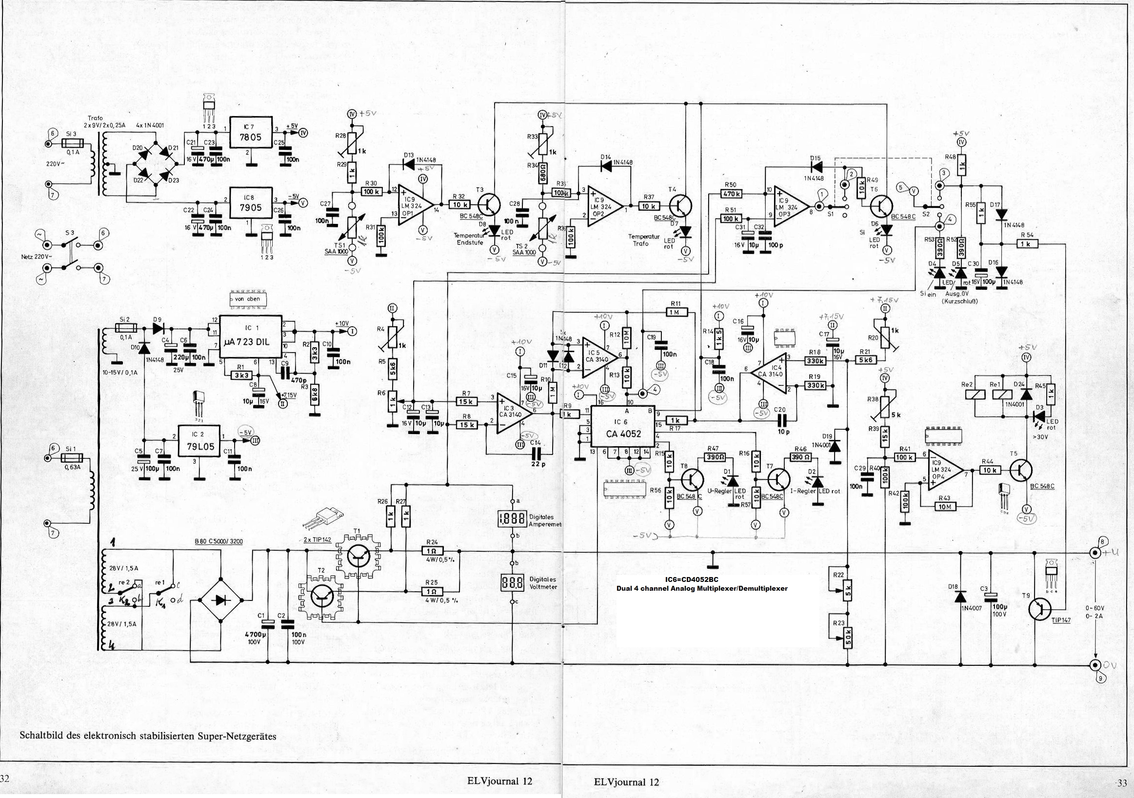 Nemrég a kezembe került egy régi (talán 86-os) német Elektor újság, amelyben a következő labortápot találtam, teljes dokumentummal, leírással, nyáktervvel, és persze (az akkor még elmaradhatatlan) fólia nyákkal. -0-60V/0-2A -relés előválasztó (leddel jelezve) -hő érzékelők (led) -DC on/off kapcsoló -feszültség és áramgenerátos visszajelzés (led) -fesz durva és finom szabályzó -digit amper és voltmérő -kereskedelmi forgalomban ma is kapható alkatrészek (talán a hő érzékelő elemet -SAA1000- nem kapni) Elég jól néz ki, de nem igazán értem a lényeget, mit keres (mint csinál) egy labortáp központi elemében egy Analóg Multiplexer/Demultiplexer? (lehet hogy meg kéne tanulnom németül) Mivel az Elektoros leírásokkal nem szokott gond lenni, biztos vagyok benne, hogy ez egy jól működő kapcsolás, és (majdnem) minden benne van ami az itt is tárgyalt és készülő tápokat illeti. Addig is fölteszem, mint érdekesség.