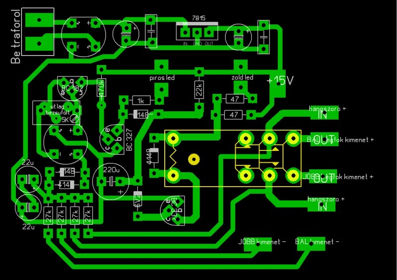 Egyelőre nem mértem DC szintet. A kapcsolásod kapott egy 15 voltos stabilizátort. A négy darab dióda helyére egy grécz híd került. Igazából ennyi a módosítás az eredeti rajzhoz képest. Ha csak tápfeszültséget kap akkor működik rajta az időzítés és a védelem is. Ha a védelem próbájához egy /idegen/ feszültséget használtam. ekkor már KB 2 voltnál bontja a relét. Ha csatlakoztatom a hangszóró kimenet akár - akár a+ pontját a nyákhoz a relé nem húz be. Bocs most indulnom kell dolgozni.
