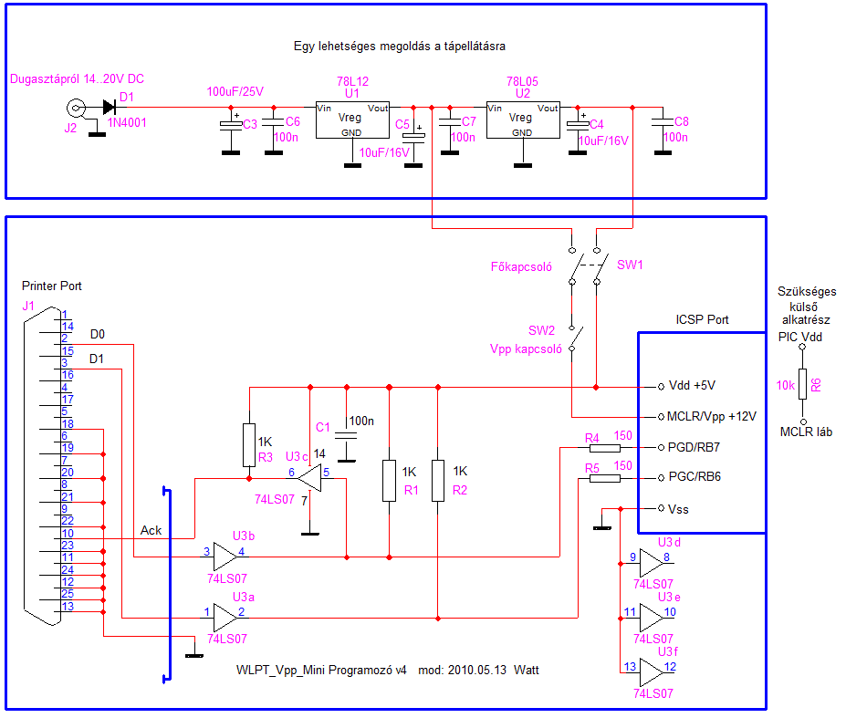 A következő módon kezdem a PIC programozást: semmilyen kábel nincs alapból csatlakoztatva, a két kapcsoló kikapcsolt állapotban. Elsőként rákapcsolom a tápot (kapcs.üzemű adapterről 17V), aztán bedugom a párhuzamos portba a saját csatlakozót, ezután elindítom a szoftvert (WPB), pipát teszek a WLPT_mini mellé, a port beállításokat megcsinálom (alapból is jó volt). Ezután az ICSP kábelt csatlakoztatom a céláramkörhöz (PIC-hez), majd bekapcsolom először a főkapcsolót, utána a Vpp kapcsolót, majd rákattintok a PIC azonosítása gombra. Ekkor kidob egy hibaüzenetet, hogy nem ismerte fel a PIC-et. 3 lehetséges okot ír: nincs csatlakoztatva PIC a foglalatba (bent van), nincs bekapcsolva az égető tápja (be van), vagy nincs csatlkoztatba a printer porthoz (be van dugva). Ha bedugom a csatlakozót az LPT portba, ki kéne írni valamit a számítógépnek? Ilyet nem csinál. Kicseréltem a PIC-et, hátha tönkrement a programozási próbálgatások során, betettem egy vadiújat, de azt se ismerte fel. Van valami ötletetek? üdv, Kiwy