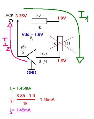 Ha a kapcsolók ki vannak kapcsolva, akkor mindkét vonalon 1.9V van, a WPB-ben lévő pipával és anélkül is. Ha bekapcsolom a kapcsolókat, akkor meg 5V van mindkét ponton a WPB-ben lévő pipától függetlenül. És ez baj a leírásod szerint. De hogy mi lehet az oka, egyelőre nem jöttem rá. Ha meginvertálom a vonalakat, ha nem, ugyanazt mértem (ez is elég fura). Neked van valami ötleted? Az áramkör jó, mégegyszer átnéztem, kábelek jól kontaktálnak. Én már arra tudok gondolni, hogy az LPT porttal lehetnek gondok a PC-n. De ez csak kósza ötlet. Amit még megnéztem, hogy az LPT port a 378h és 379h címeken van. A 378h-hoz van egy alapérték (amikor nem állítottam be semmit a WPB-ben), ez decimális 12 volt (hexa: 0x0C). A 379h-s címhez pedig azt írta, hogy ACK = 5V. Bármit csináltam, végig 5V-ot írt ki. Az már csak külön érdekesség, hogy ugye megmértem multiméterrel is, és a kapcsolók kikapcsolt állapotában 3.35V, bekapcsolt állapotában 5.0V-ot mértem. Ezzel kapcsolatban találtam egy érdekességet, amit a mellékelt ábrán lerajzoltam. A kapcsolók kikapcsolt állapotában van ez. Ez okozza az 1.9V-ot mindenhol ilyenkor, mert 1.9V kerül a Vdd vonalra a kapcsoló mögötti részen (ahol a meghajtó IC meg az LPT port van). Az R1 ellenállás két pontján ugyanaz a potenciál, tehát olyan, mintha ott sem lenne. Megmértem az R3-on átfolyó áramot (1.5mA): az ohm-törvény alapján is ennyinek kell átfolynia rajta. Most már csak az kérdés, hogy az ACK vonalon (ami megegyezik a meghajtó IC 6-os lábával) miért van 3.3V... Főleg úgy, hogy az IC Vdd lábán 1.9V mérhető, ami azt jelenti, hogy az IC kimenetén maximum 1.9V lehetne.