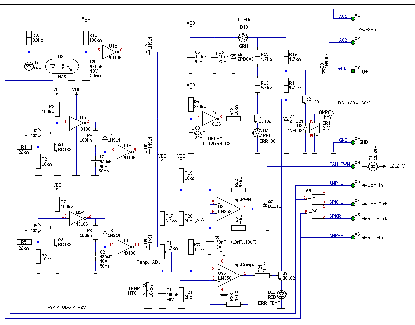 Hogy legyen egy kis "vita indító", felteszek ide egy védelem rajzot. Az alapötlete már közel 30éve működik a QUAD405-ömben. Éppen ki lett egészítve egy ventilátor vezérléssel és egy hőfok védelemmel. - A bemenőköre kísértetiesen hasonlít az általánosan ismertre, de működési elvében még is csak egészen más. Az áramkör tulajdonképpen azt figyeli, hogy az erősítő kimenete, ha valamelyik feszültségoldalra kitér a vezérlés hatására, akkor visszatér-e 50ms-on belül. A 10Hz alsó határfrekvenciát feltételezve. (Avagy minimum 50ms-onként a jel átmegy-e a nullponton.) Mert ha nem, akkor a védelem leold. - Az AC figyelés is hasonlóan működik. Mert a váltófeszültség 20ms-onként kisüti a C4 kondit. Ha a váltó 50ms ideig nem jelenik meg, akkor szintén működésbe lép a védelem. A megoldás előnye, a galvanikus elválasztás, így nincs gond, ha az erősítőben a +- tápfeszültséget két külön Greatz állítja elő. (mint hogy már volt vele többször gond..) - A bekapcsolási késleltetést R9 és C3 biztosítja. Jelenleg 6-7sec között van. - Az áramkör tápfeszültségét a végfok tápjából nyeri (kivétel a ventilátort működtető feszültséget). A Z1 dióda, és a Q6 tranyó stabilizálja a relé feszültségét, így a 24V-os relével, az áramkör 30..60V tápfeszültség esetén változatlan lehet. - A borda hőmérsékletét egy 10kohm-os termisztor figyeli, és PWM módon szabályozza a vennti fordulatszámát. A PWM frekvencia a C8-al állítható be a számunkra megfelelő értékre. (Nem túl szerencsés a PWM vezérlés, mert lassú freki esetén "lökdösi" a ventit, míg magasabb freki esetében hallani a PWM jelet. De átalakítható analóg üzemmódra is, ha R22 és C8 alkatrészeket elhagyjuk. Ekkor a Fet-re esetleg hűtőborda kell.) - Ha a ventilátor már nem tudja ellátni a feladatát, akkor a borda tovább melegszik, és működésbe lép a hőfokkomparátor. Ez szintén aktiválja a védelmet, lekapcsolja a hangszórókat (terhelést) a végfokról. Körülbelül ennyi a működési elmélete. Gondolom sokan eltúlzottnak fogja találni a megoldást, de tőlem ennyi telik. Gondolatébresztőnek, de esetleg ne adj ég után-építésre, azért alkalmas lehet a kapcsolás. üdv! proli007