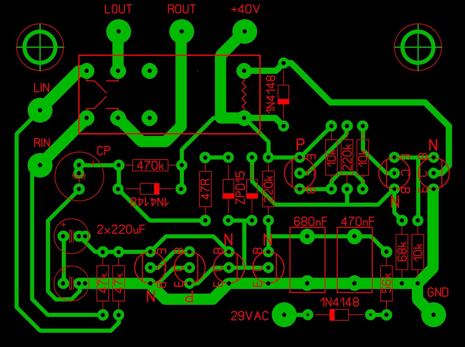 Ha a két db 220µF -os kondit rögtön az egyenszint figyelő tranzisztorok mellé teszed, akkor a végfok kimenetekről nem kell olyan hosszú fólián vinni a jeleket a 47 kOhm -okra, mert azok mehetnek a CP alá, vízszintesen. A nagyjelű rész minél rövidebb fóliákon legyen jelen szerintem. Nagyfrekin egy ekkora hosszú fólia már antenna, ami gerjedésre hajlamos végfok esetén már elég a visszacsatoláshoz. |