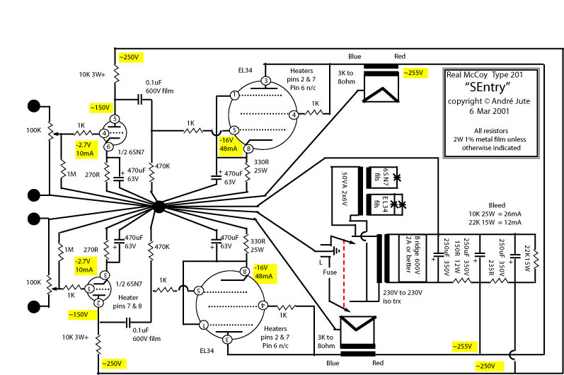 Amit én nem tartok jónak, az a bemeneti potméter kapcsolása. minden csőnek van -ha pici is- rácsárama. Ez keresztül folyik a potméter csúszkáján, és jelentős recsegést tud okozni, mert a csúszka átmeneti ellenállásán fellépő feszültséget hozzáadva a hasznos jelhez, a fokozat felerősíti. Mivel jelentős fokozatonkénti, és teljes visszacsatolás van, valószínűleg nem lesz rossz minőségű az erősítő.
