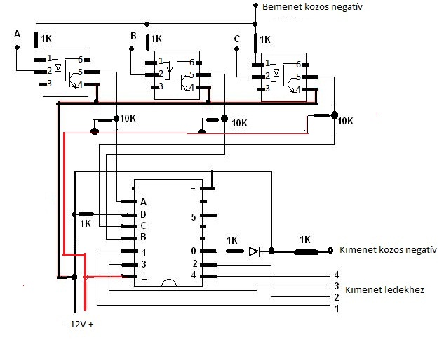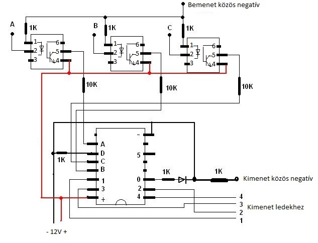 Tehát az opto tranzisztor emittere neg tápon, a kollektora a 10 kohm (?) ellenálláson, ide jön a dekóder IC bemenete, a 10 Kohm ellenállás másik vége poz tápon. A nem használt bemenetek lehúzása földre egyszerűen földre (neg tápra) kötve, felhúzása poz tápre 1 - 2 kohm ellenállással. Ez azonban logikai 1 -et jelent a dekódolásnál!