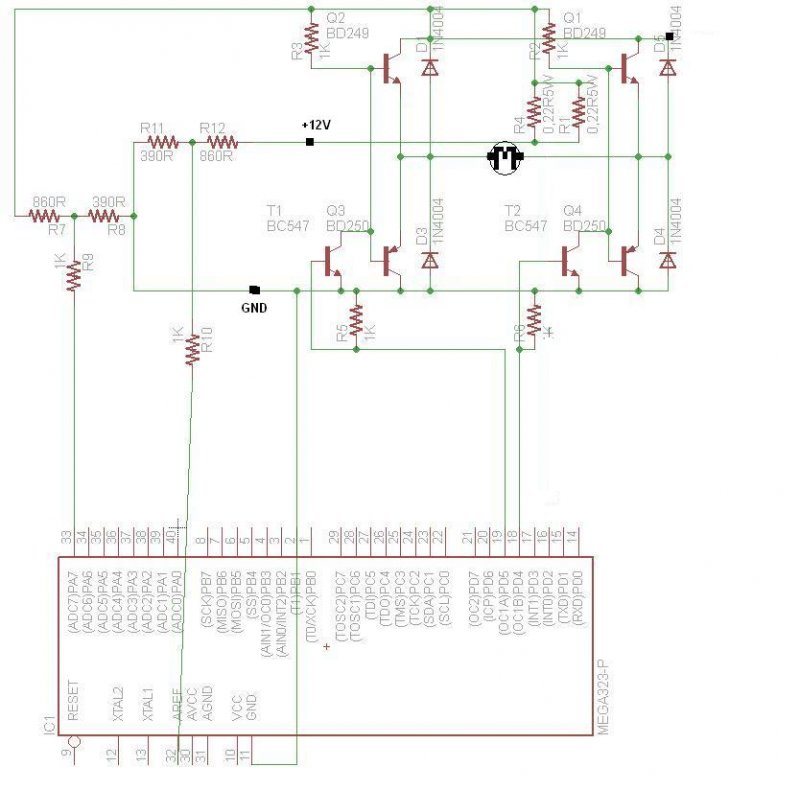 Valaki mondana véleményt a rajzról hogy működőképes-e? Pwm vezérelné a tranyókat, és a két párhuzamos 0,22R-en mérném a feszültséged az adcvel a 12v hoz képest mennyit esik, pl ha megszorul a motor.