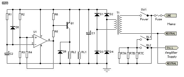 Álljon itt egy másik lágyindító kapcsolási rajz. Megépítése drágább, plusz trafót is tartalmaz, de a bekapcsolása megbízhatóbb. Ráadásul a bemérése nem olyan veszélyes, mert az időzítő kisfeszültség alatt működik. Sajnos alkatrész adatok nincsenek. A teljesítmény ellenállásokat is relé kapcsolja, ez talán túlzott óvatosság, de így a kapcsoló biztos nem terhelődik túl. A kapcsolást "soft starter"-re keresve találtam.