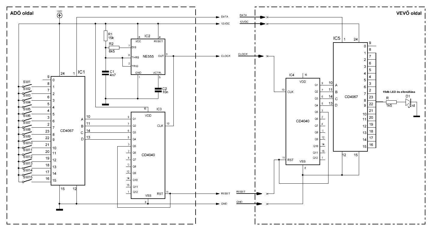 Igen a RESET lába 'elrajzoltam' a valóságban a vevő 4040 IC reset lábát az ADÓ oldal vezérli.