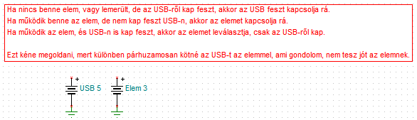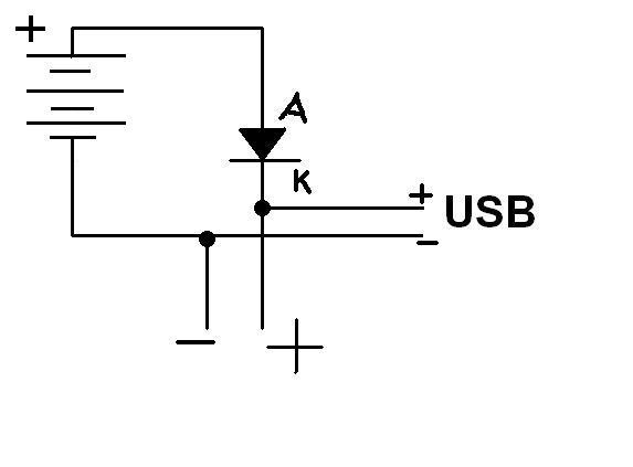 Egy tisztességes SI dióda akkor nyit, amikor az anódján 0,5-0,6V-al magasabb feszültség van, mint a katódon. Így a 3 elem feszültsége 4,5V körül van, amikor azonban rákapcsolod az USB-t, a dióda lezár. Viszot ha lehúzod az USB-t, a dióda A-ján 4,5V lesz a K (0V) feszültségéhez képest, ezért a dióda nyit, és jó 3,9-4V fog megjelenni az áramokör kimenetén.