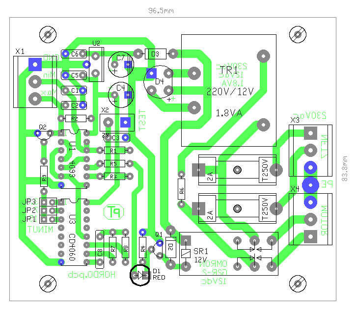 Kissé előre löktem a projektet. Megterveztem a nyákot. (Persze továbbra sem építettem meg, sőt nem is fogom..) A nyák, elvileg egy 100*100-as ABB dobozba beleillik. Kicsit átalakítottam, hogy az időzítés "programozható" legyen egy Jumper-el, vagy egy átkötéssel. Nem egy nagy kaland, de tőlem ennyi telik. üdv! proli007