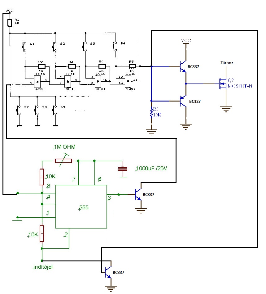 Terveztem egy ilyet, szerintetek működni fog? And kapuk csak a helyes sorrendre adnak logikai 1-et végeredménynek (5V) ezzel vezérelnék egy bc337-bc327 fetmeghajtót, ami a zár tekercsének az áramát kapcsolná, az 555-ös kapcsolás meg negatív indítójelre elkezd kondit tölteni, a töltőáramot lehet állítani a potival, amivel be lehet állítani az időintervallumot, hogy meddig legyen nyitva a zár, majd ha a kondi feltöltött, pozitív lesz a kimenete (3-as láb) és ezzel reseteli az and kapukat? Értelmes ez így?
