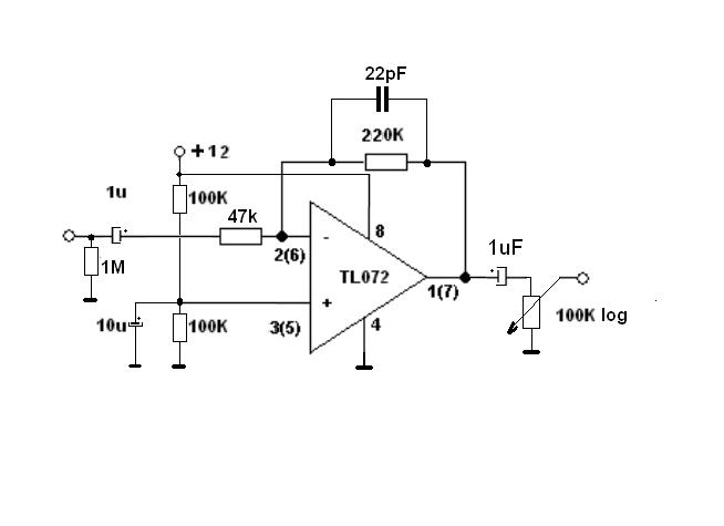 Az erősítés a visszacsatoló (220k) és a bemeneti (10k) hányadosa. A rajz szerint 22x -es. Bementi ellenállásnak 47k -t javaslok. Ekkor már csak 5 -szörös az erősítés, de ettől nagyobbra ritkán szokott szükség lenni.