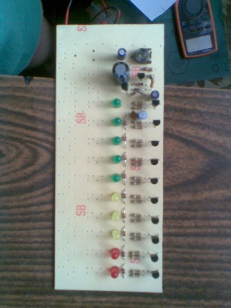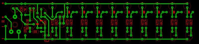 Az áramfelvétel attól is függ, hogy mekkora áramot állítasz be a LED-eknek. Ha 10mA/LED akkor 130-140mA a 3915-nél, mely logaritmikus kijelzést ad mint a spec hang 3916. Az is kérdés hogy futópont, vagy fénycsík az üzemi állapot, vagy a rajz szerinti átkapcsolós az utolsó LED felvillanásakor.